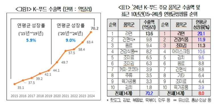 K-푸드의 2020년부터 2024년까지 최근 5년간 성장률은 수출이 9% 성장했으며, 이중 라면이 20.1%로 가장 높게 나타났으며, 2위는 건강식품(11.9%), 3위는 조미김(11.3%) 순으로 분석됐다.